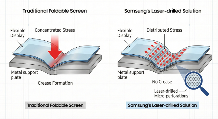 屏幕折叠时的压力也是这样,新技术不是“消灭”压力,而是聪明地把它“导流”走了。那具体是怎么“导流”的呢?“i冰宇宙”猜测三星在金属显示支撑板上面用激光打出了密密麻麻的微型孔洞。当屏幕弯折时,压力会通过这些微孔被巧妙地分散到整个平面上,避免了在一条线上“硬扛”。
