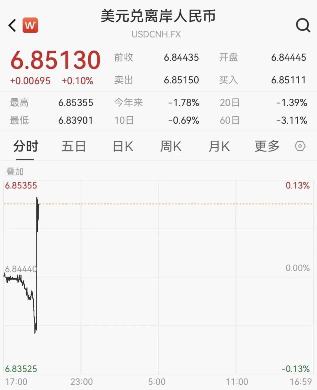2月27日早间,离岸人民币兑美元短线跳水,由涨转跌,失守6.85关口。